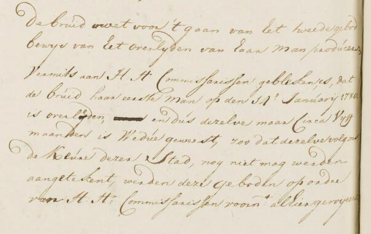 Gelukkig kent hij Jacoba Fijs, een weduwe met vier kinderen bij hem in de Oosthavenstraat. Met haar wil hij best weer in het huwelijksbootje stappen. Dus gaan ze op 14 juli 1770 naar de kerk voor de ondertrouw. Zij moet alleen nog de overlijdensakte van haar vorige man overleggen. Tja, dan komt de aap uit de mouw. Want ze is pas vijf maanden weduwe. Ze kan wel zwanger zijn van haar overleden echtgenoot. Het laatste wat de hoge heren commissarissen willen, is onduidelijkheid over de afstamming van een ongeboren kind. Dus wordt er voorlopig niet getrouwd.