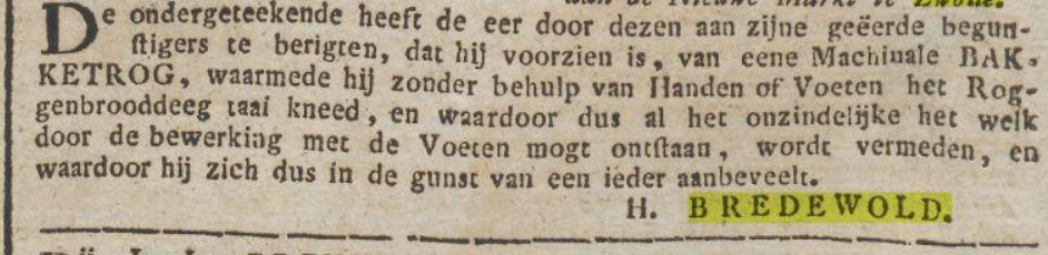 Niemand die over de voeten valt. Totdat een fabrikant van machinaal gereedschap een slimme marketingtruc bedenkt. Hij wijst de bakkers fijntjes op het belang van hygiëne voor een goede gezondheid. Dat vindt tenslotte iedereen belangrijk, dus zien de bakkers er wel brood in. Mijn voorvader Hendrikus Bredewold plaatst in 1828 deze advertentie in de Overijsselsche courant: