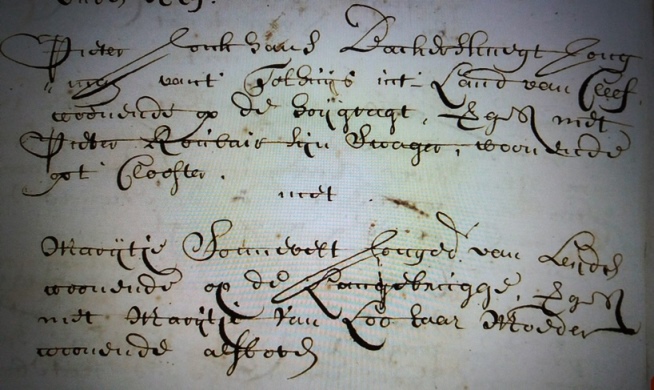 In die periode trekken er veel bakkers vanuit Duitsland naar het westen toe. Jordaan de Greef zou best eens Pieters werkgever kunnen zijn. De andere Pieter is zijn zwager. Een kleine twee jaar later trouwt Pieter Jonkhans met de hoogzwangere Leidse Marijtje (van) Sonnevelt. Anderhalve maand na de kerkelijke ondertrouw komt Christoffel, hun eerste zoon, ter wereld.